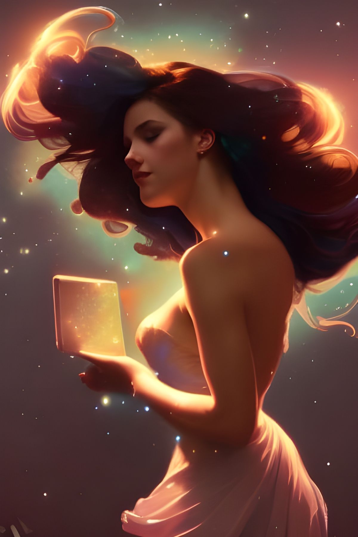 A portrait of a beautiful woman with stars and nebulas in her hair. Soft dramatic lighting enhances the ethereal fantasy aesthetic, reminiscent of splash art.
