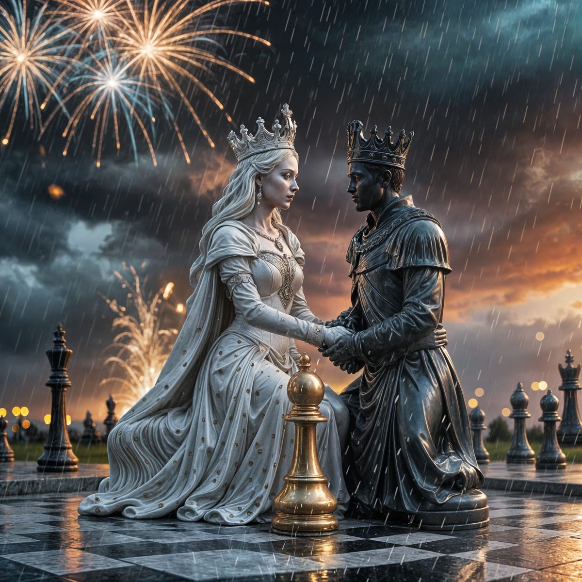 This image shows a hyperrealistic rendering of a white queen and black king chess piece embracing on a chessboard. Fireworks explode in the sky, lighting the scene with mood lighting.