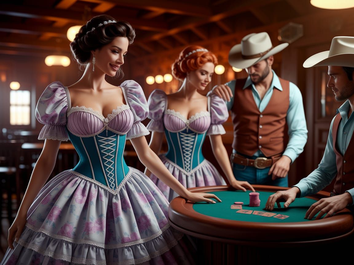 This image depicts a statuesque brunette saloon girl standing elegantly in a warmly lit vintage Western saloon. She's surrounded by rich, earthy tones and soft golden light, with intricate details in her hair and dress textures. A red-haired saloon girl stands beside her, while a blonde saloon girl leans...