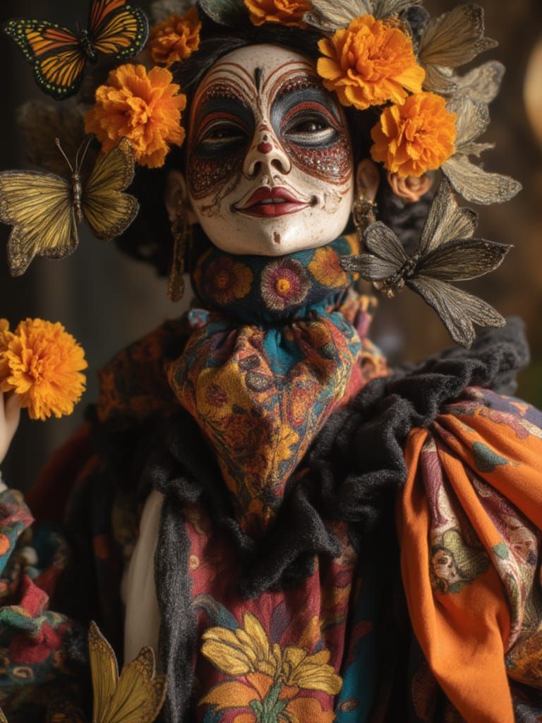 This autochrome-inspired fantasy scene features a woman with vibrant Dia de Los Muertos makeup and intricate sugar skull designs, surrounded by monarch butterflies. Warm golden light creates a dreamy, fluid atmosphere.