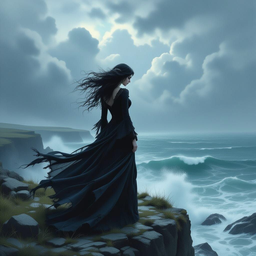 This image depicts a solitary, sorrowful woman in a gothic dress on a cliff above a stormy sea. Rendered in a detailed illustrative style, it evokes a sense of deep melancholy with dark clouds and jagged rocks.
