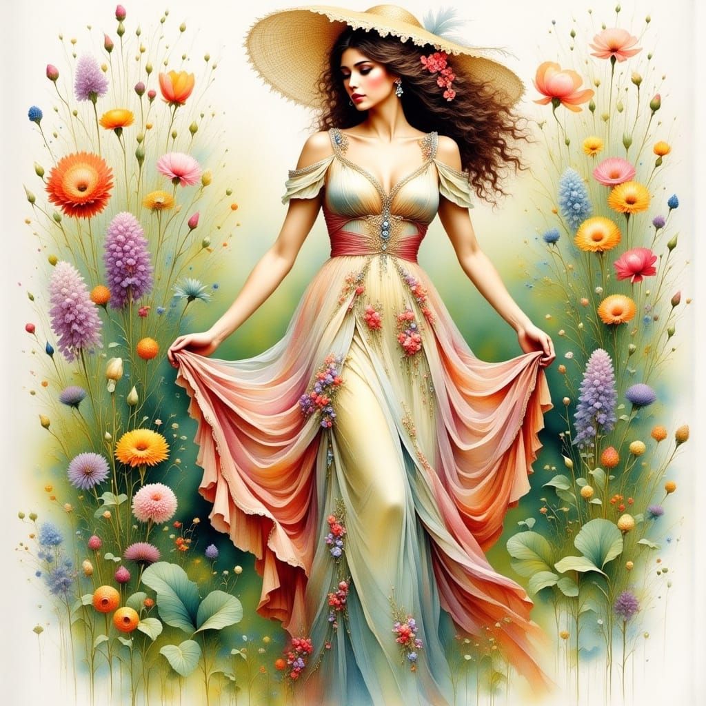 A watercolor image of a woman in a dress, amidst flowers and plants. The artwork evokes a vintage aesthetic with soft brushstrokes and blended colors.
