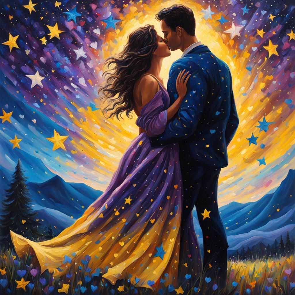 This image shows a couple embracing under a starry sky, their clothing merging with the cosmic landscape. Hearts float around them in this vibrant neo-impressionist painting.