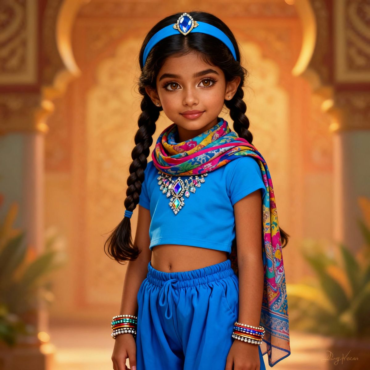 This image shows a young Indian girl with braids, a scarf, and blue clothing, featuring brown eyes and bracelets. She has light brown skin and a headband.