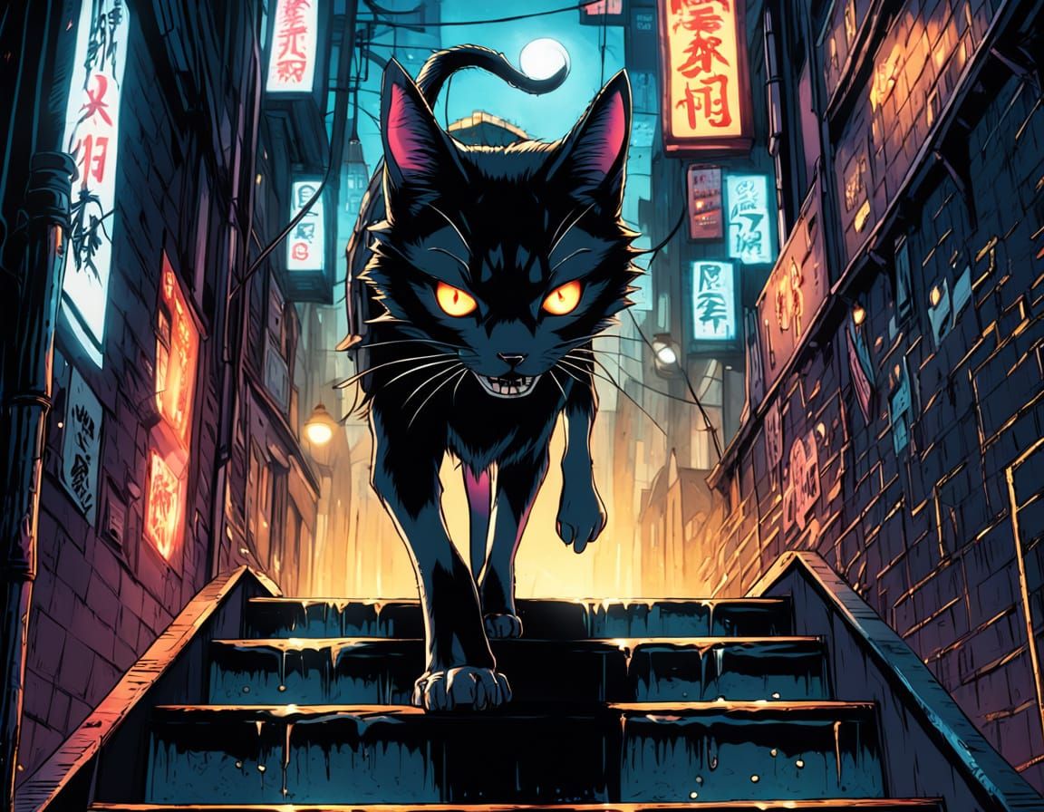 This image shows a young girl with black hair walking up stairs in a narrow urban alleyway at night. The digital illustration features vibrant manga style, glowing eyes and sharp teeth in an eerie atmosphere, with neon signs reflecting off wet pavement.