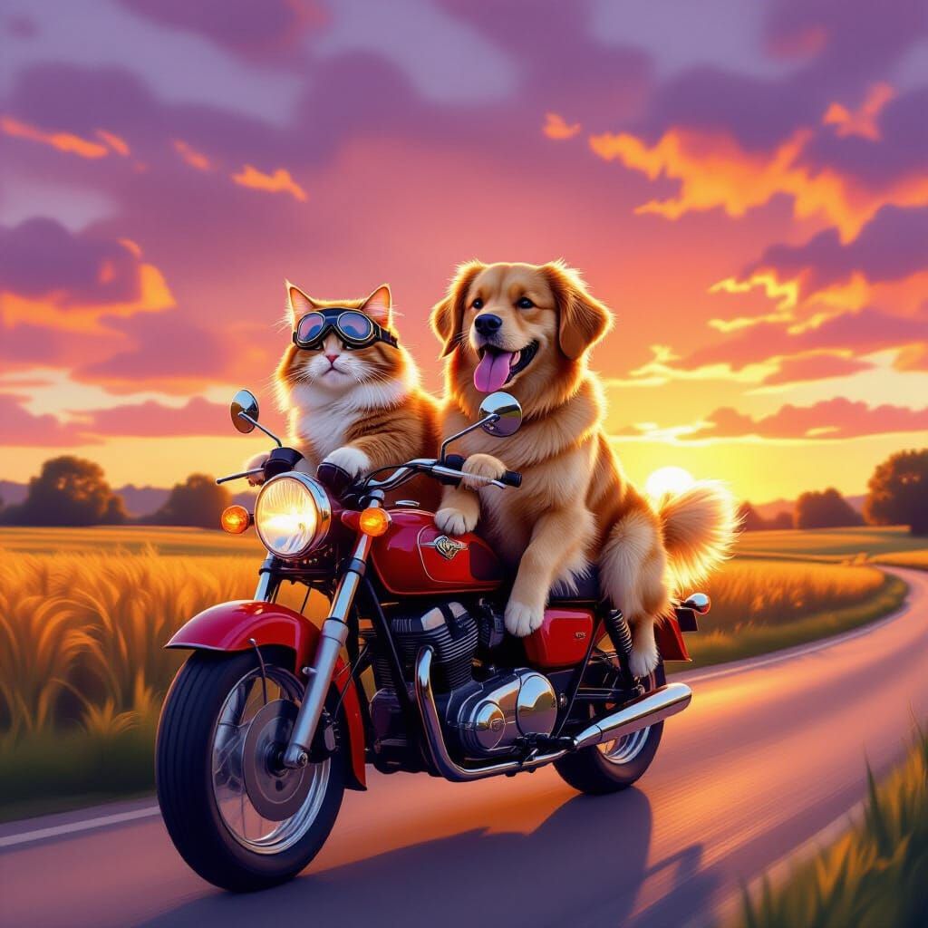 This image shows a ginger cat and golden retriever on a vintage motorbike at sunset. The scene features warm, golden hour lighting and a vibrant sky, created in a digital matte painting style with soft lighting and dynamic composition.