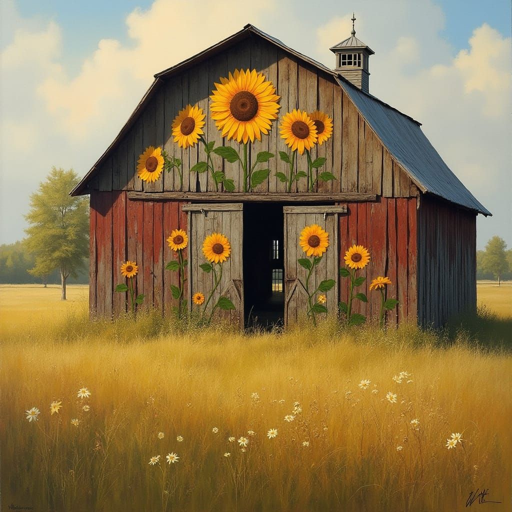 A sunlit vintage barn featuring prairie grass and wildflowers. The barn has a sunflower mural above its doors, rendered in a rustic, folk-art style reminiscent of classic American paintings.