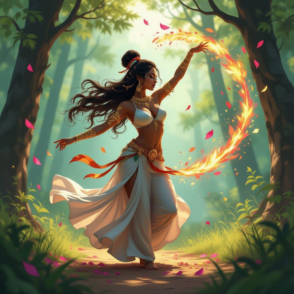 A graceful forest mystic in a seductive, dynamic pose, mid-dance in a sun-dappled clearing. Her body, adorned with glowing golden tattoos, twists elegantly as she summons a whirlwind of shimmering leaves and petals around her, showcasing her mastery over the natural world.