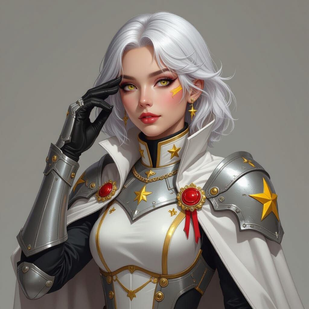 Easily generate characters with pink skin, silver eyes, silver hair and yellow highlights using our free AI image generator.