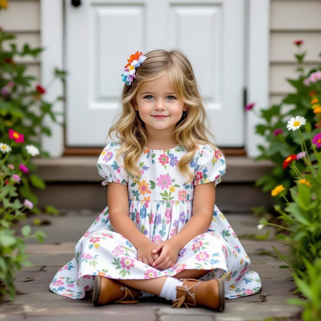 This image depicts a dreamy young girl sitting on the ground with flowers in her blonde hair. She wears a colorful striped dress and striped socks, rendered in a whimsical illustration style.