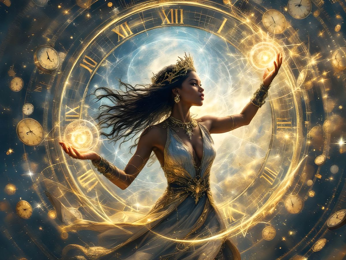 A striking picture of a Black female chronomage casting a spell amidst clock imagery. Volumetric lighting enhances this HDR masterpiece with a golden hour glow and exquisite detail.