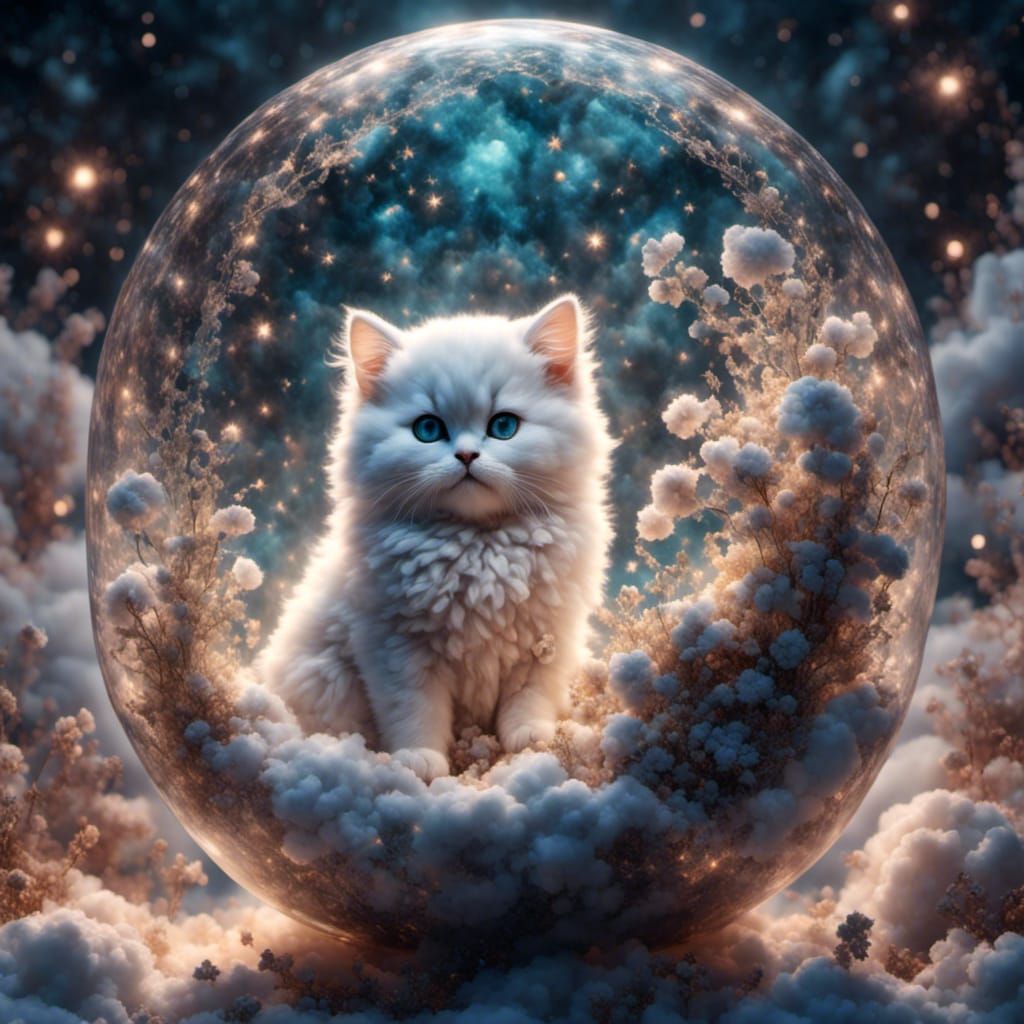 A fantastical image of kittens and puppies shaped like fluffy white clouds inside a crystal snow globe. The scene is rendered in ultra-high resolution, with realistic textures.