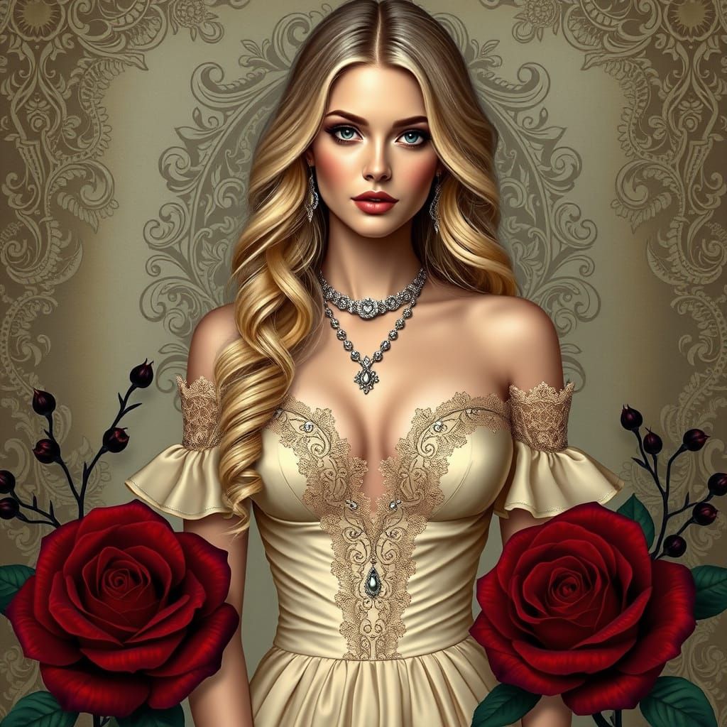 A digital painting of a beautiful woman with long blonde hair and striking eyes. She wears an elegant champagne gown with lace details, set against an ornate background. A romantic and fantastical aesthetic.