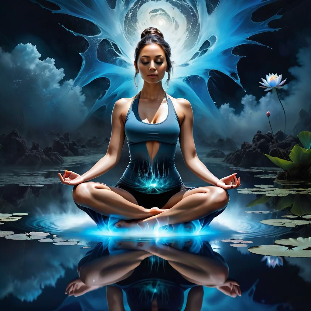 A captivating image of a woman in a lotus yoga pose on a pond. The background features a surreal aurorascape with reflections, mist, and dramatic lighting, reminiscent of fine art.