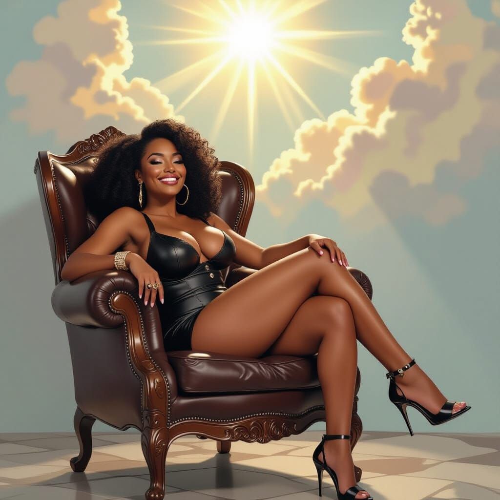 This image shows a smiling black woman in a leather outfit and stiletto heels, lounging across an ornate chair. The artwork features complementary colors and fine details, illuminated by soft, heavenly sunshine.