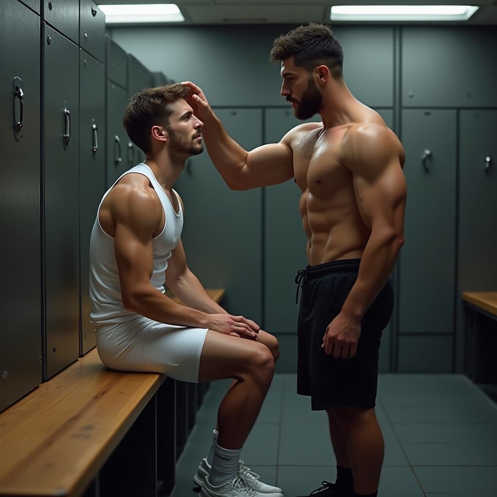 A photorealistic portrait of two athletic men sharing a private moment in a gym locker room. One man sits on a bench in athletic wear, while the other stands shirtless beside him.