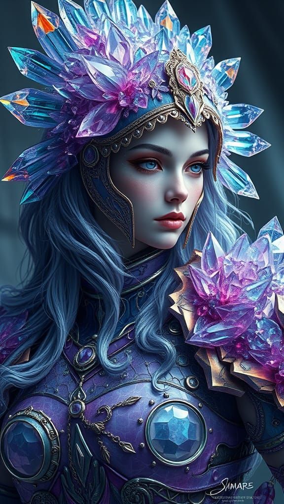 A digital rendering of a female warrior clad in crystalline armor. The hyperdetailed image features intricate carvings, reflective jewel tones, and floating crystals, rendered in a photorealistic style.