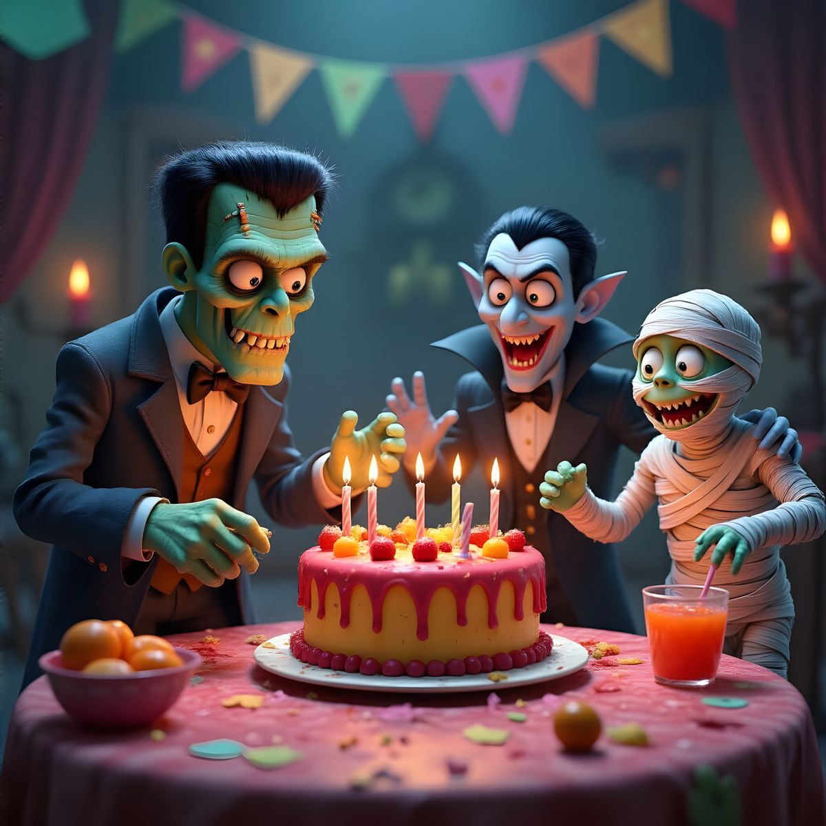 This image shows a chaotic and humorous monster birthday party with Frankenstein, Dracula, and a mummy. Features cinematic lighting and a Pixar-style charm.