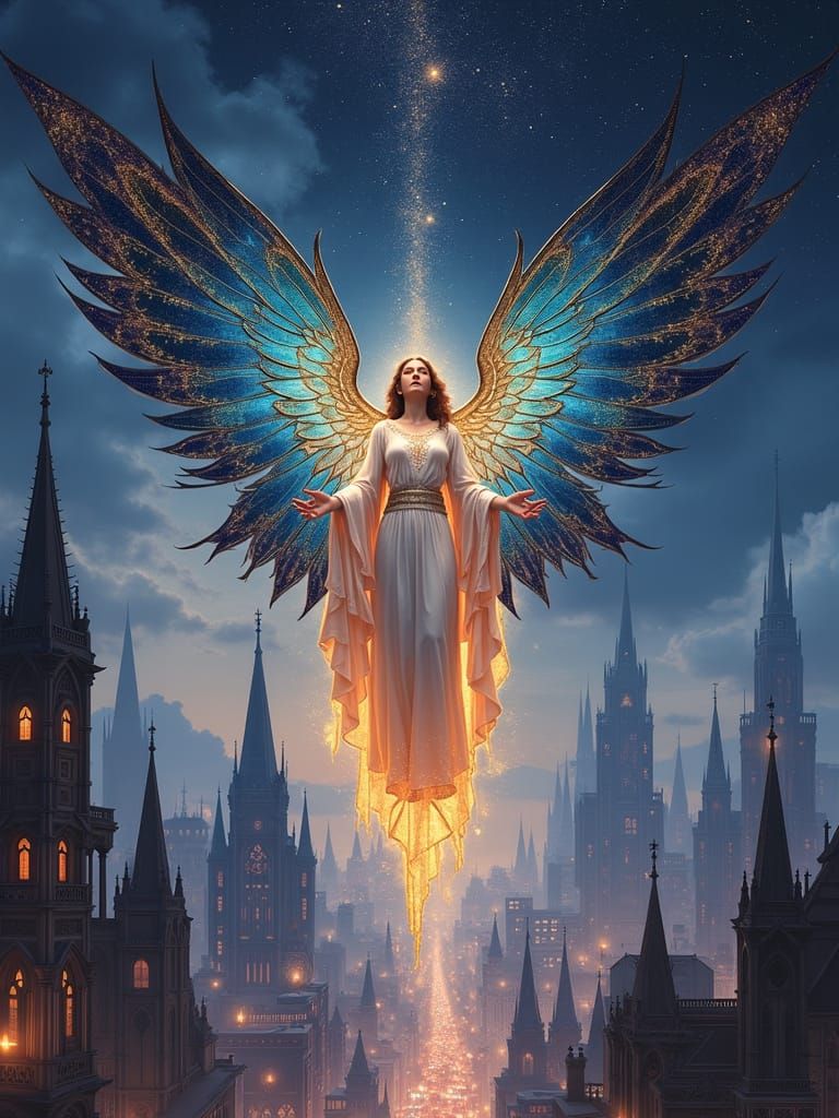 This image depicts a divine figure with stained-glass wings over a city blending gothic and modern architecture. The art style is dark fantasy religious illustration with ornate, flowing details.