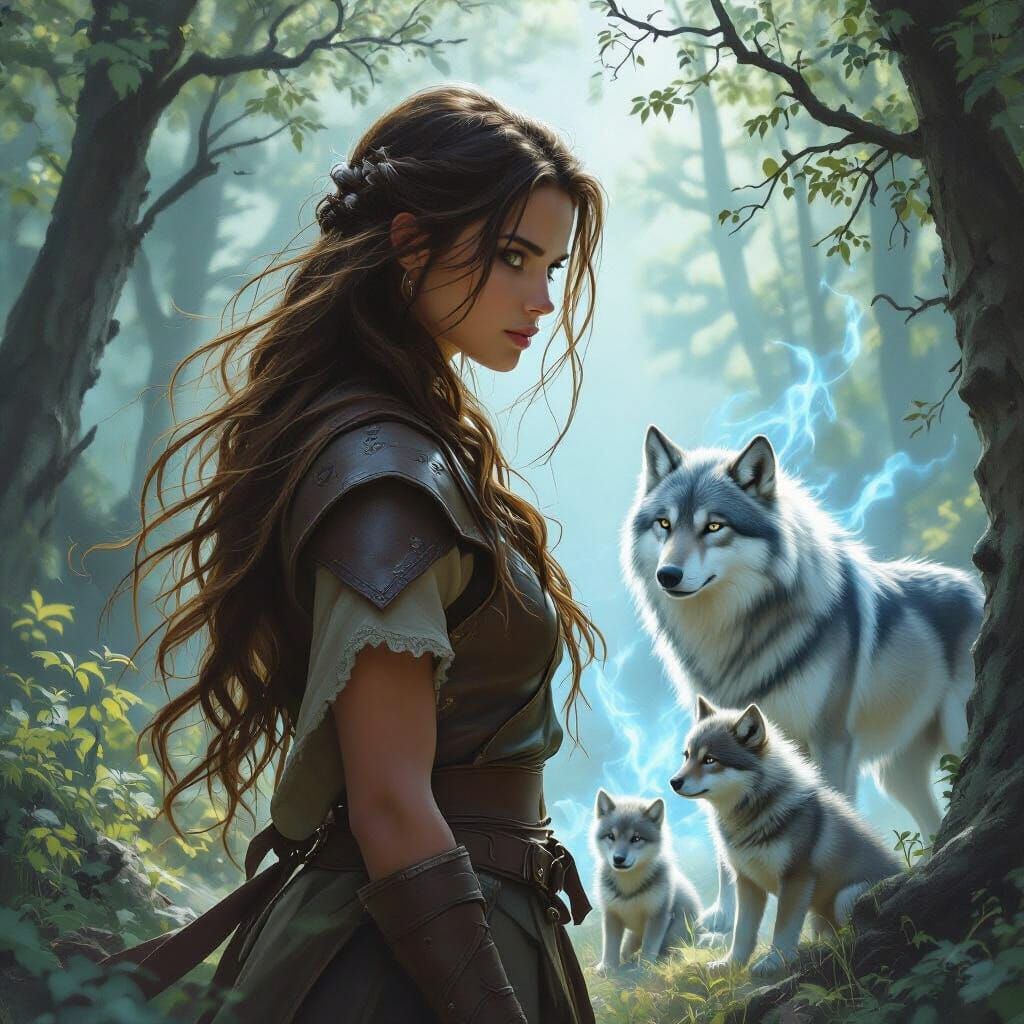 This image depicts a serene forest scene with a woman and her protective Dire Wolf family, bathed in an ethereal blue light. It is rendered in a dramatic digital matte painting style.
