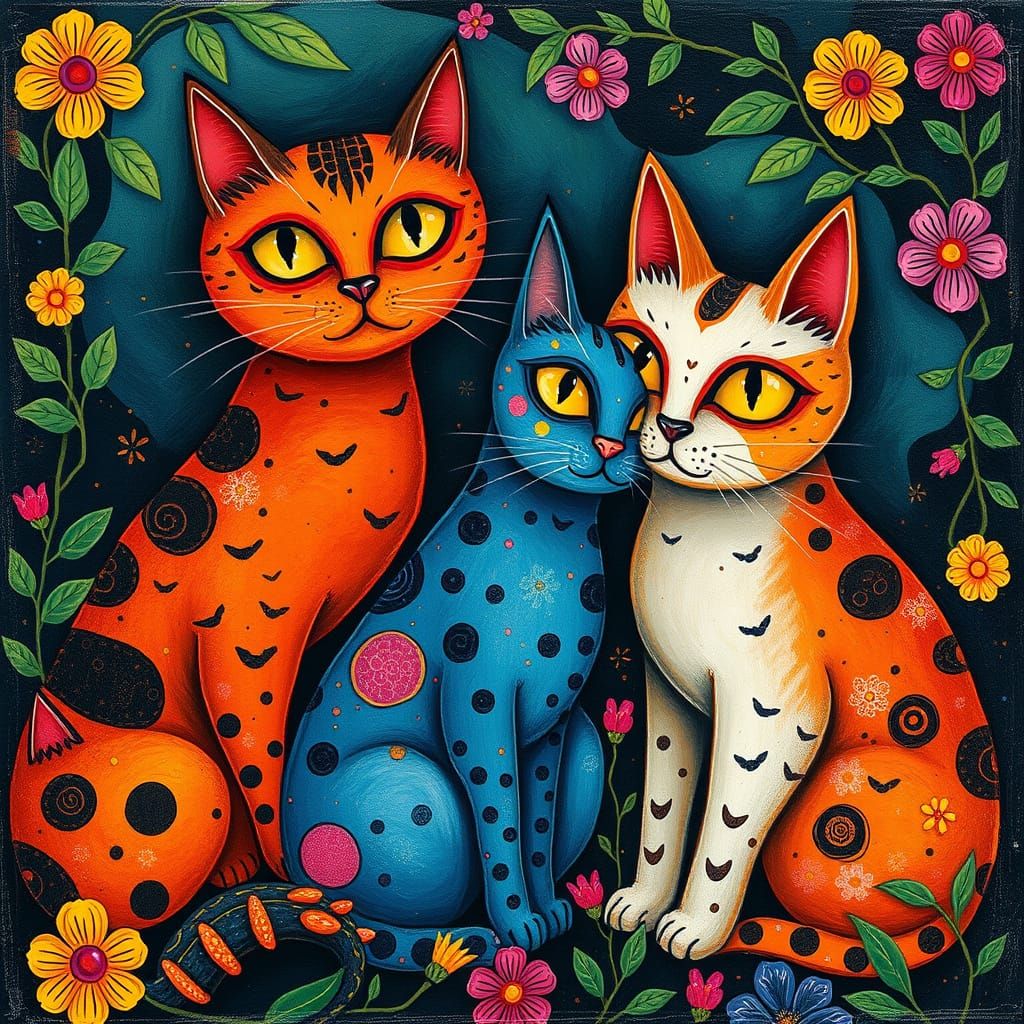 This image is a dreamlike depiction of whimsical cats in a fantastical environment, characterized by bold brushstrokes, intricate patterns, and clashing colors, reminiscent of Naive art and surrealistic illustrations.