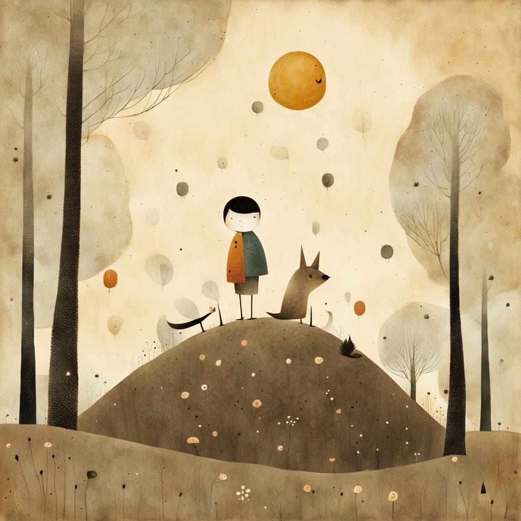 A whimsical illustration of a wanderer, reminiscent of a children's book. The image features a magical and quirky primitivism art style.