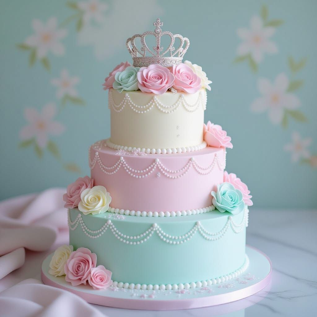 A multi-tiered princess birthday cake in soft pastel shades, decorated with roses, glitter, and pearls, topped with a crown. Features a magical, elegant digital art style with diffused lighting.