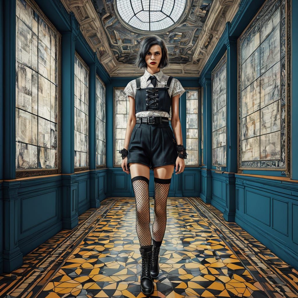 This image depicts a modern, elegant lady in Gothic attire, presented in a pop art style with contrasting shades and triadic colors. Rendered in 8k resolution, it follows principles of golden ratio and symmetry.