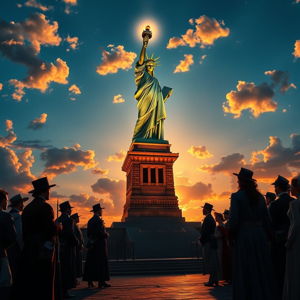 This enchanting scene depicts a majestic Statue of Liberty being presented to the French by Americans in 18th-century attire, set against a breathtaking gradient-blue evening sky with cotton-like clouds, as if plucked from a fantasy Artstation trending splash screen, with a blend of historical accuracy a...