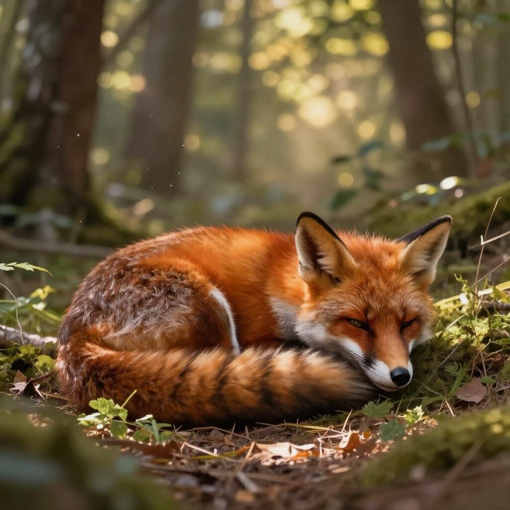 This image shows a red fox sleeping peacefully in a forest clearing. Golden light filters through the trees, creating a warm, atmospheric scene with a realistic, painterly style.