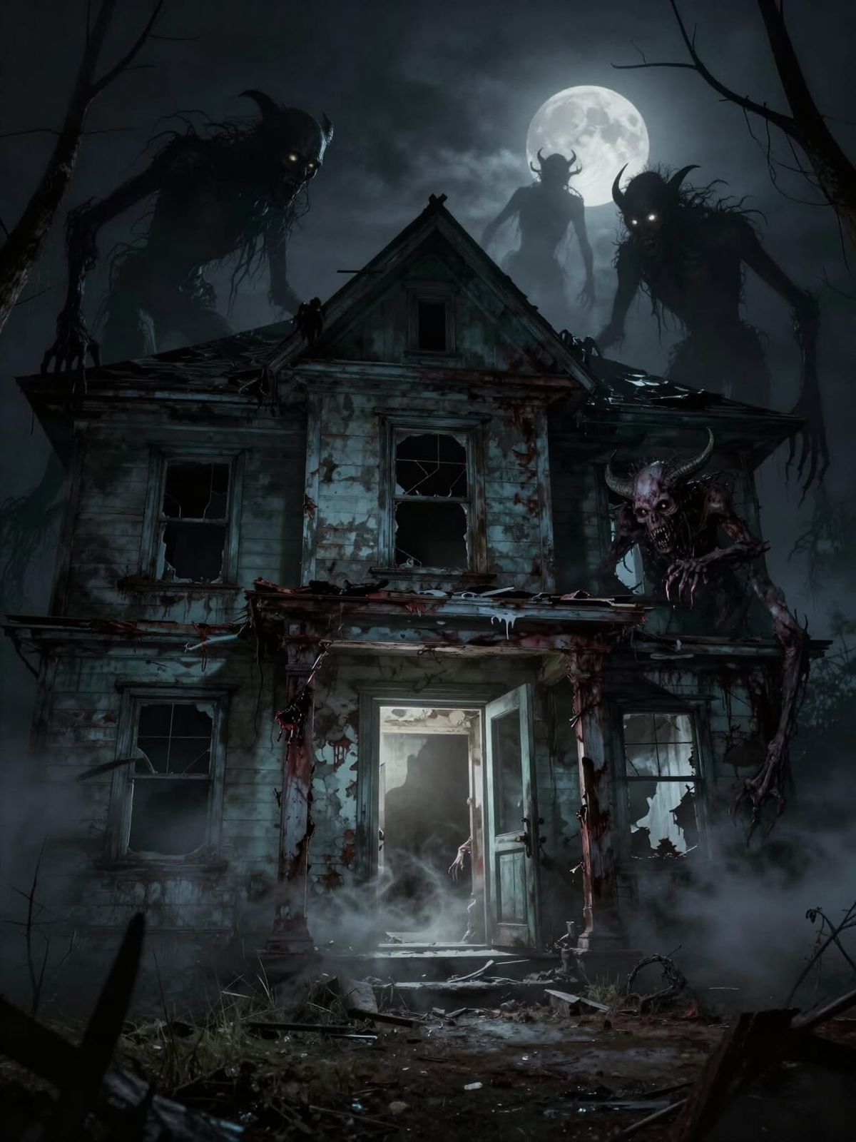 This image depicts a decaying abandoned house under a moonless sky, shrouded in fog. Shadow creatures and demonic figures lurk within, illuminated by an eerie interior light, creating a dark fantasy horror atmosphere.