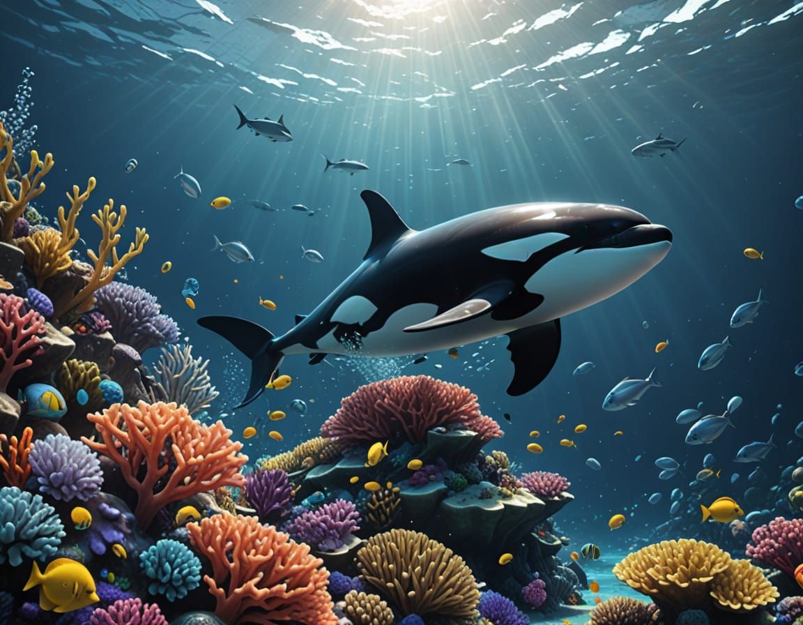 This image captures a breathtaking close-up of an orca swimming near a vibrant coral reef, teeming with life and shimmering with sunlight. The 3D anime art style brings forth a sense of dynamic movement and realistic textures, making for a stunning visual experience.