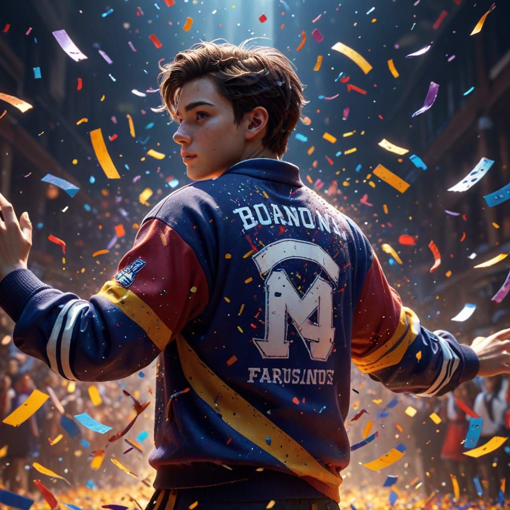This image shows a college student in team colors, surrounded by dancing confetti. The fantasy concept art features vibrant stripes, a glowing emblem, and complementary tones in 8k resolution.
