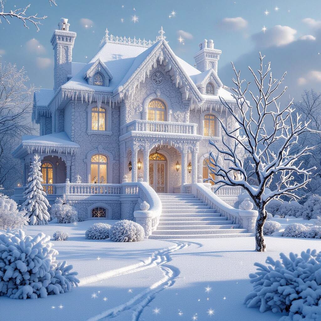 This image showcases a magnificent mansion built from snowflakes, featuring a staircase of ice. A decorated tree stands in a garden with a pristine snowflake ground, rendered in an illustrative style with a cool, luminous palette.