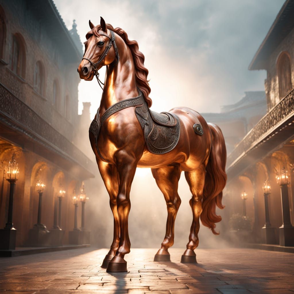 This stunning image shows a majestic copper horse standing proudly in a misty, golden-lit courtyard. The warm, vibrant scene is captured in photorealistic detail with intricate textures and soft, eerie mist swirling around the horse's legs.