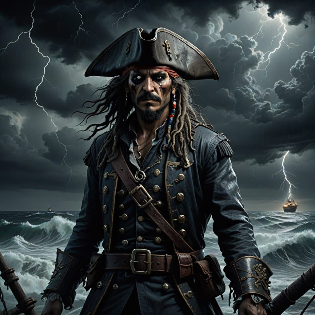 This oil painting captures a pirate captain with exaggerated features, a large nose, and an askew eye patch. Intense chiaroscuro lighting and dynamic shadows create a dark fantasy atmosphere on a stormy sea.