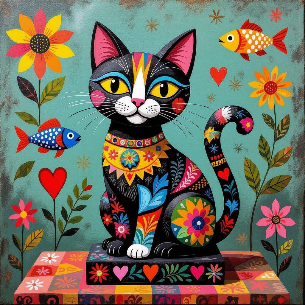 A vibrant wood sculpture of a cat with intricate carvings. Black gesso forms the base, layered with acrylic paint and pen details, against a colorful, folk art background in a Frida Kahlo style.