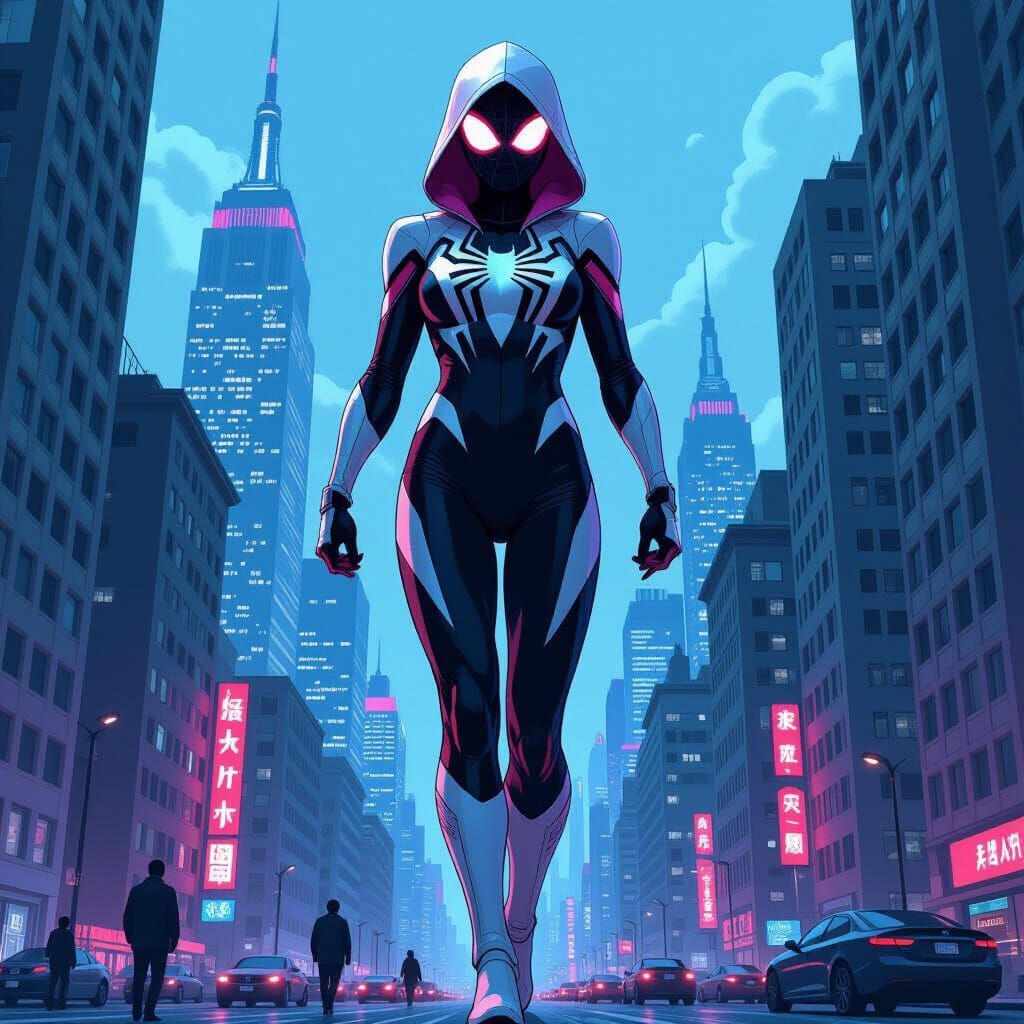 A towering, colossal Spider Gwen strides through a vast metropolis. She's suited in black and white, hood up, mask on, gazing down at the tiny citizens in a futuristic neon glow.