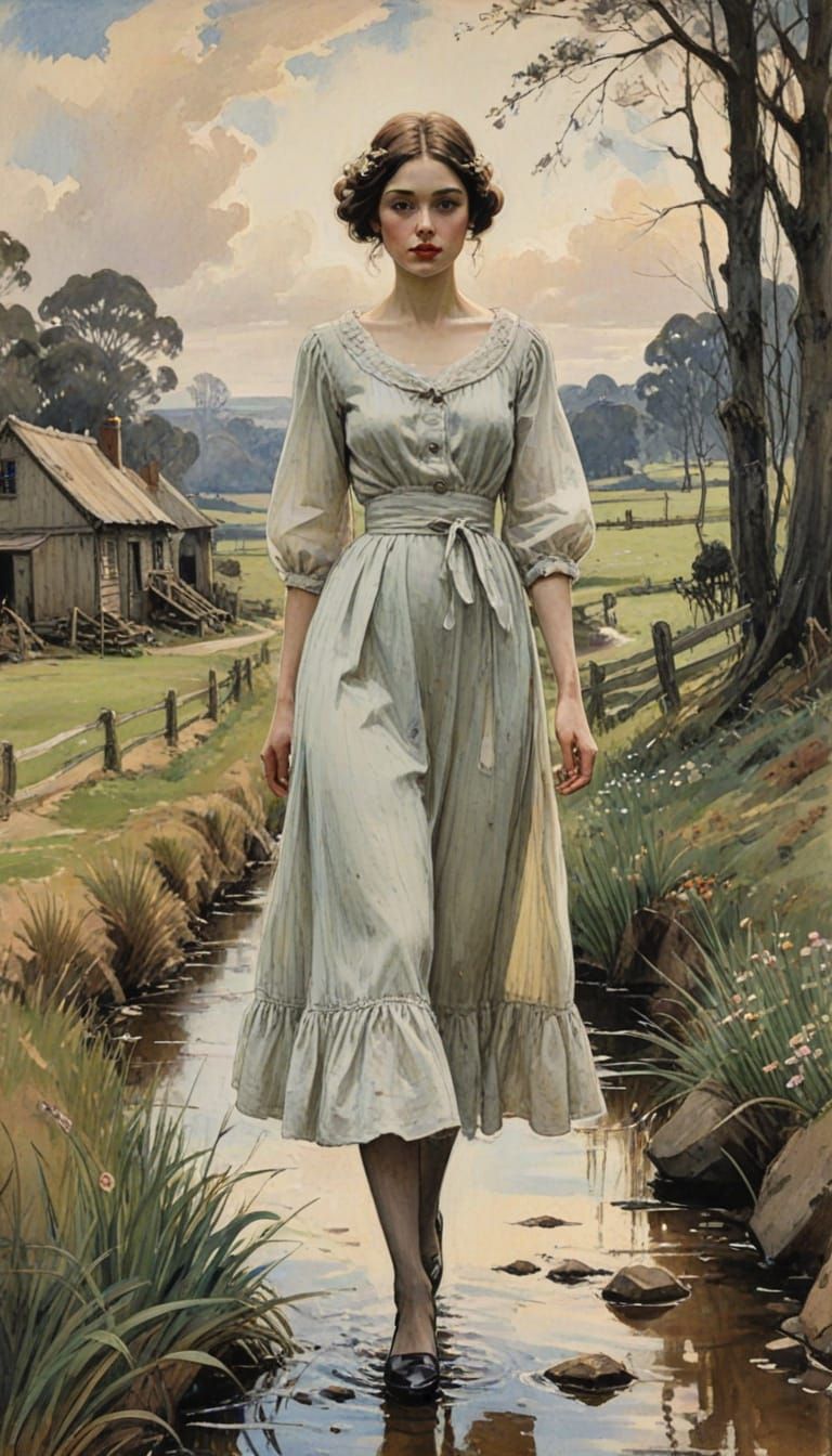 This image shows a dark, gloomy scene in a fairy grunge aesthetic. The artwork evokes a watercolor painting style with influences from several artists, portraying a cottagecore scene.