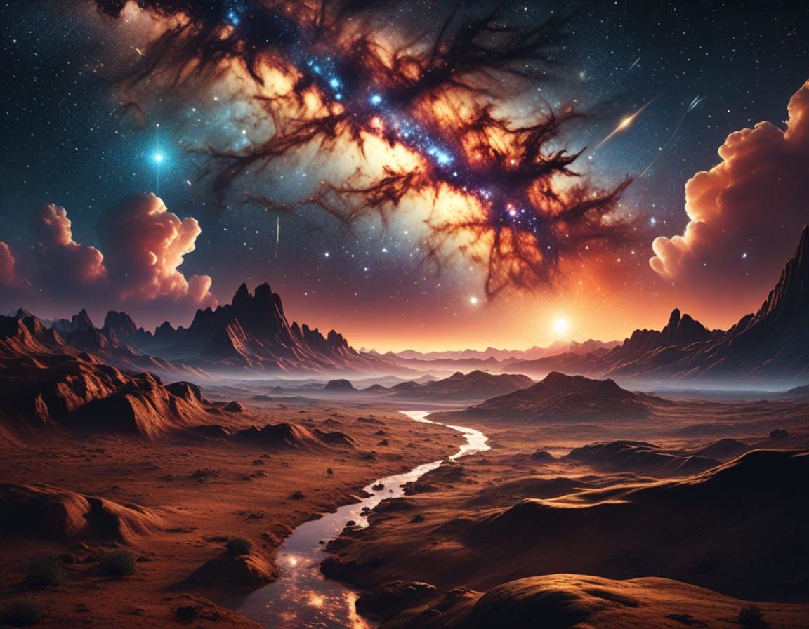 A striking picture of a photorealistic cosmic landscape featuring stars and the Milky Way. This science fiction illustration shows vibrant, glowing nebulae and a detailed, expansive galactic background with vivid colors.