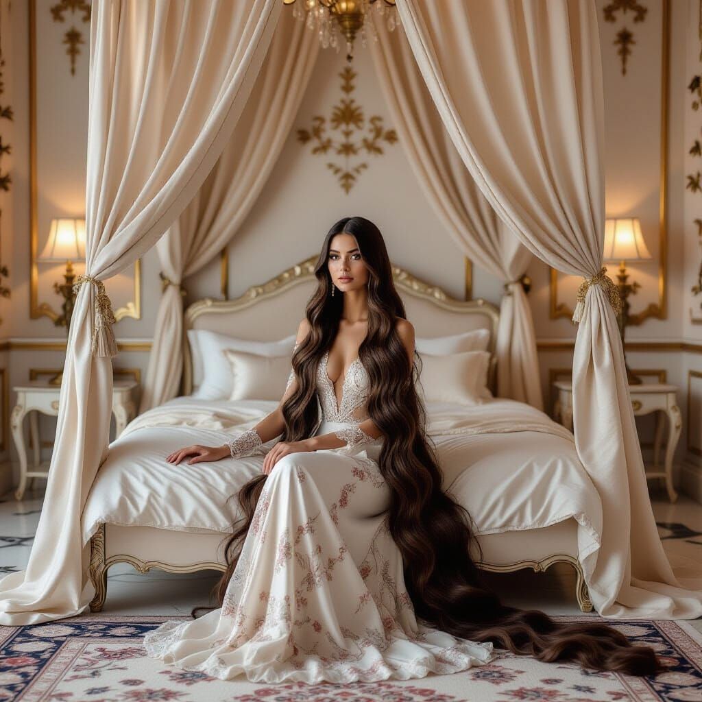 This image shows a young woman with long, flowing hair in an elegant dress, seated on a royal bed. The bedroom features golden floral designs and antique lamps, rendered with a blend of vintage and modern elements.