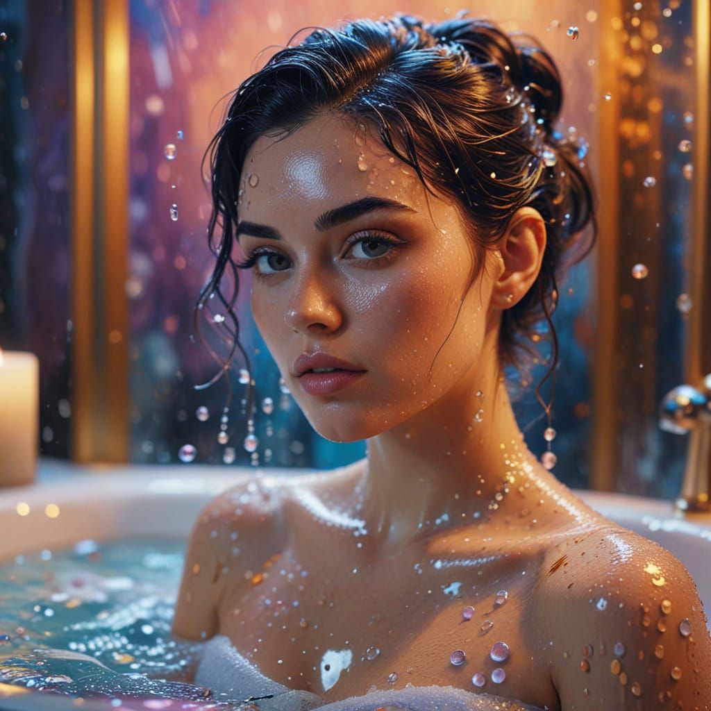 This splash art features a woman in a bubble bath, rendered with fine details and wet colors for a glossy, elegant look. Soft lighting creates a subtle sheen on her skin amidst iridescent bubbles.