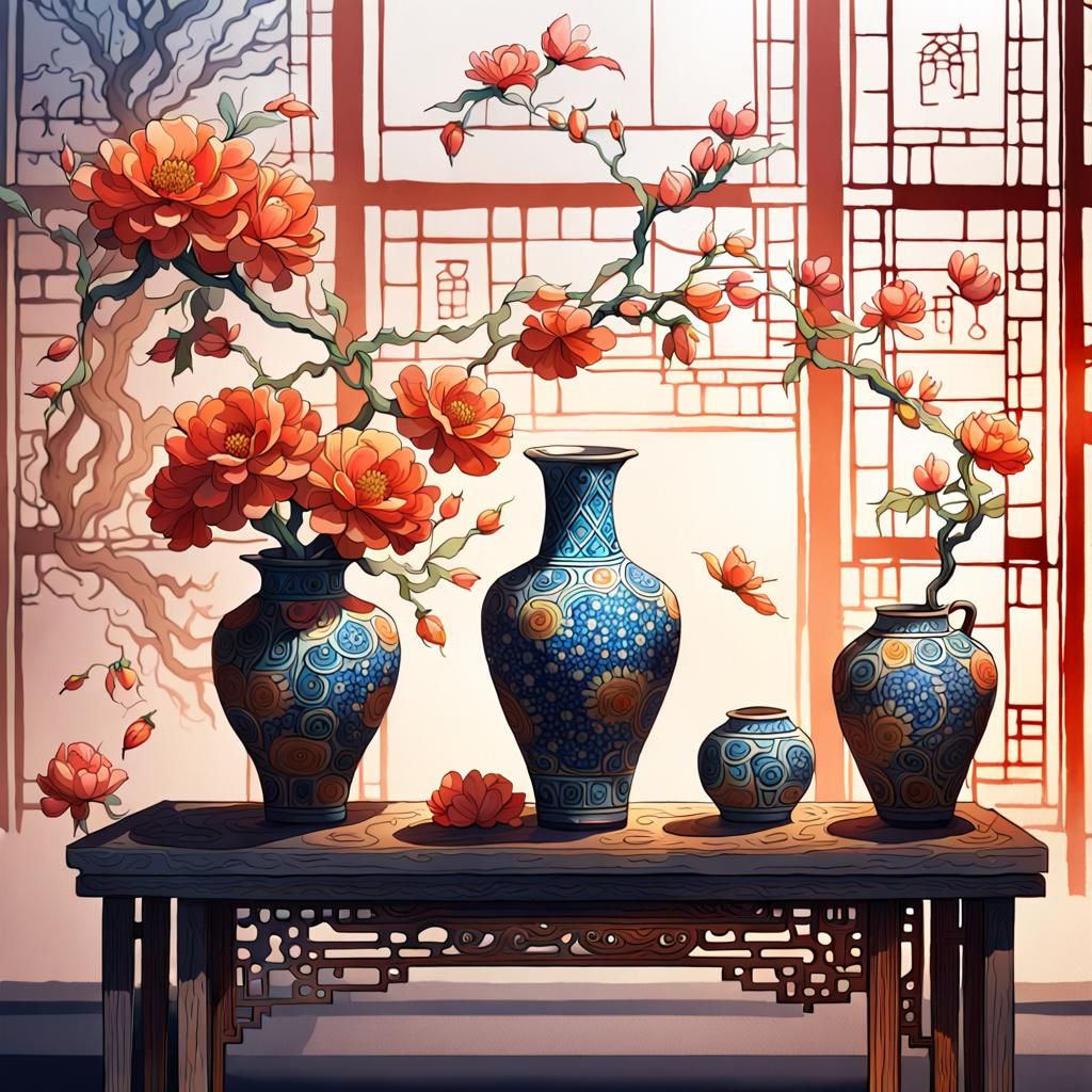 This image shows an ink and watercolor drawing of a still life featuring a flower vase. The artwork exhibits characteristics of oriental folk painting with intricate detail and deep color.