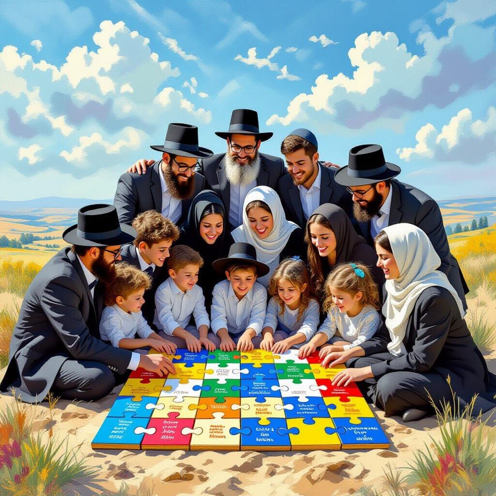 This image shows a large Haredi family depicted as a living puzzle, fitting pieces of themselves and the landscape together. The artwork features a vibrant color palette and intricate details.