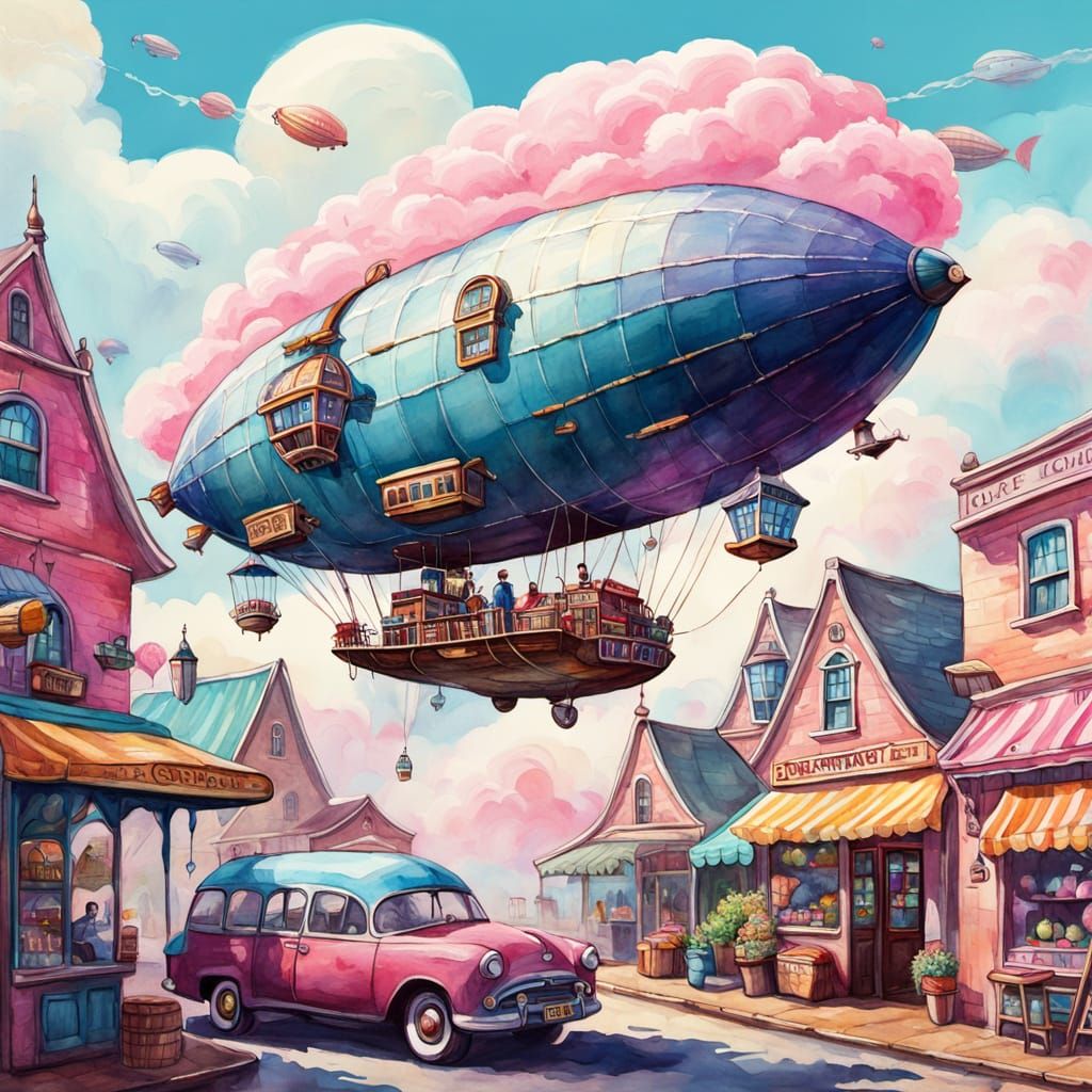 This image shows a 1950s-style airship floating near a cotton candy shop, rendered as gouache fantasy art. The artwork is colorful and dreamy, with thick brush strokes and impasto textures.