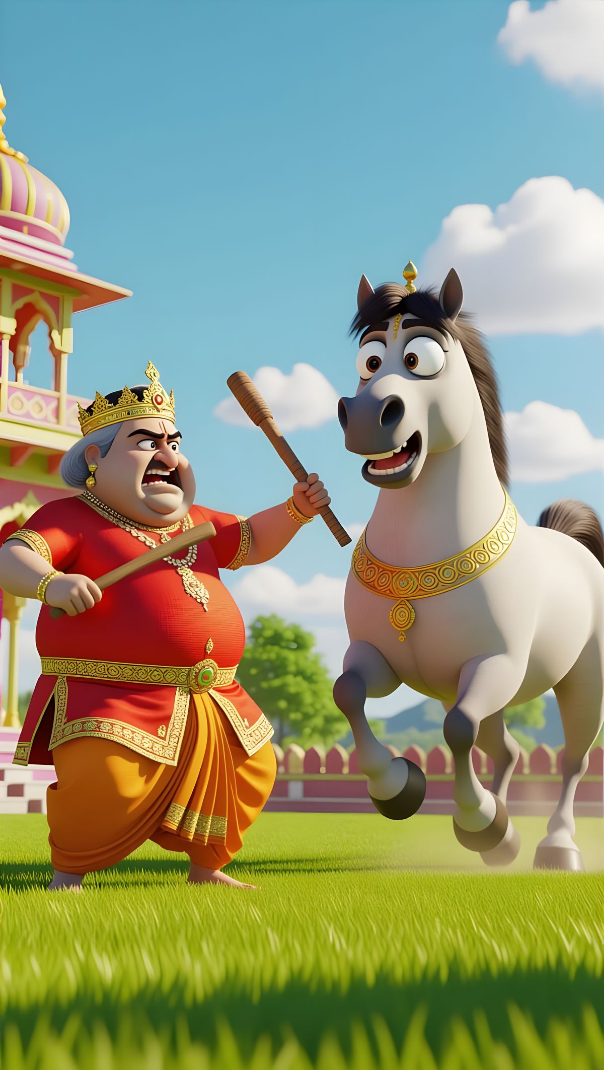 A 3D image of an angry Indian king, dressed in traditional attire, chases a frightened horse away from a colorful palace in a bright, sunny setting, with a focus on realistic and detailed visuals.