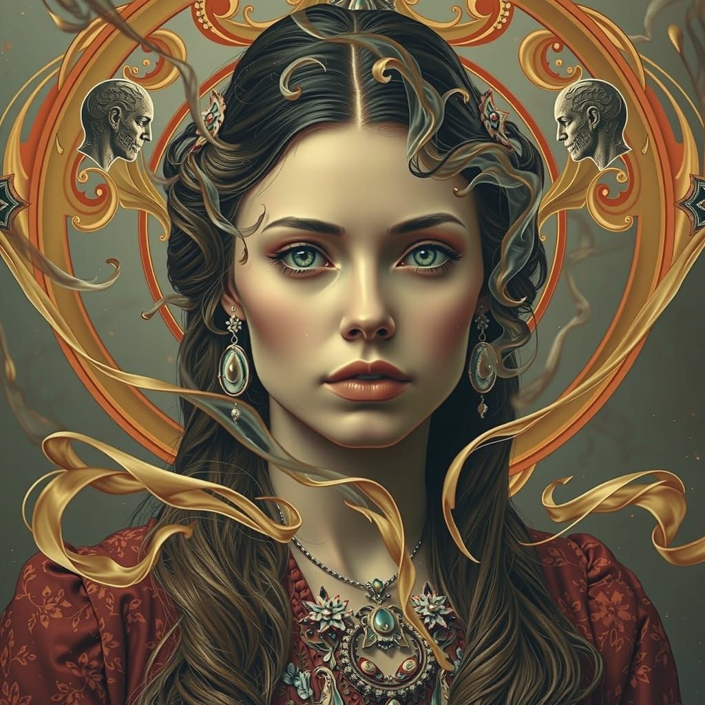 This image depicts a woman floating amidst swirling mists and smoke, rendered with hyperrealism. The artwork evokes emotive introspection and psychological symbolism.