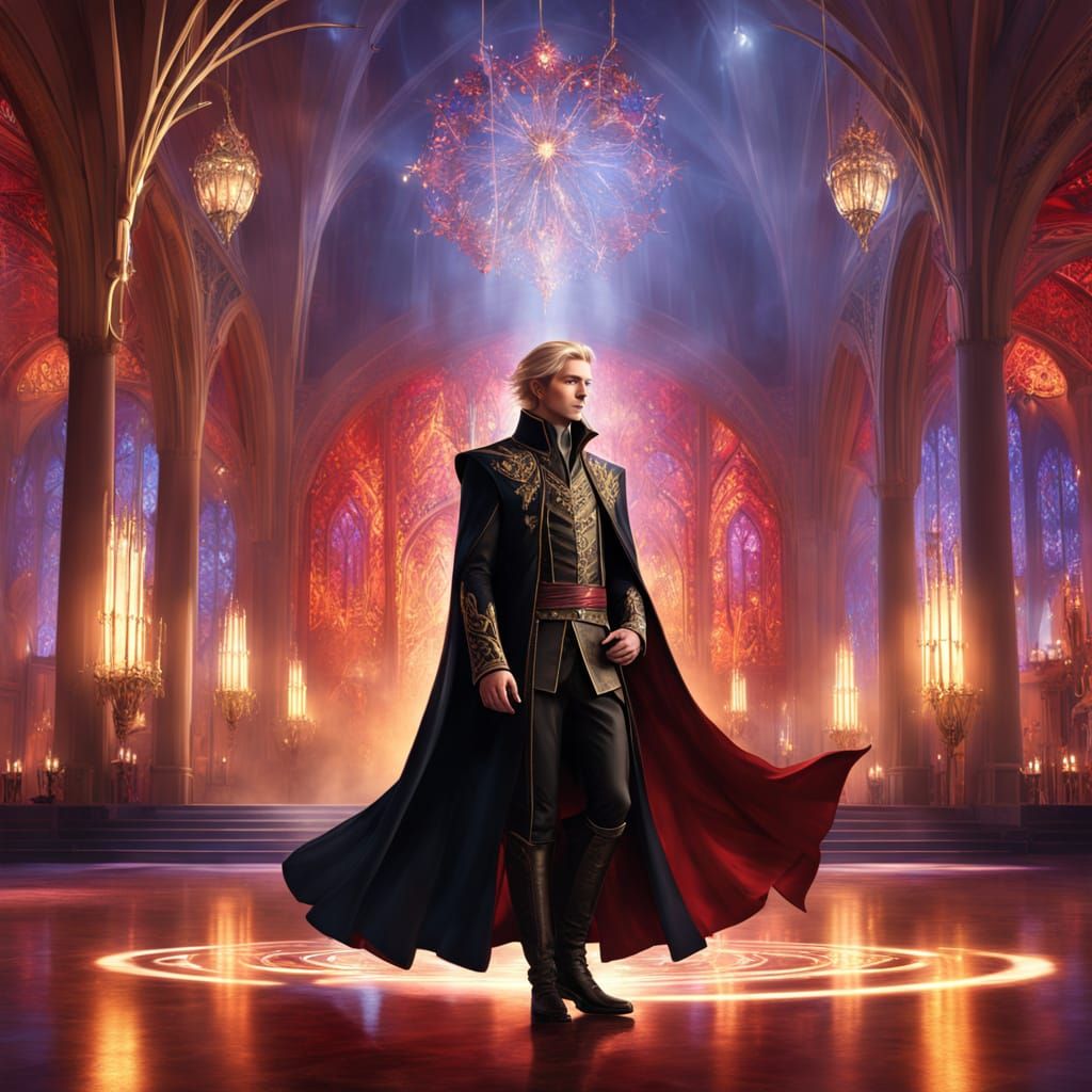 This image displays a tall, lean elf with striking features in an elegant elvish ballroom. The digital art features a black leather coat with red embroidered sigils and a golden aura, rendered with vibrant colors and cinematic lighting.