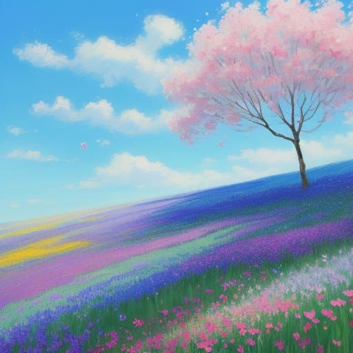A serene impressionist painting of flowers blooming in a sunlit field under a blue sky. The artwork uses soft brushstrokes and a vibrant triadic color palette to evoke a peaceful natural scene.