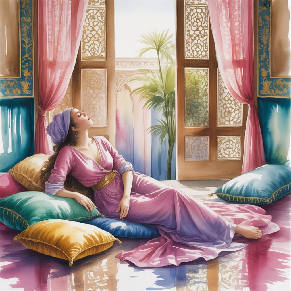 This image shows an odalisque reclining on silk cushions in a harem courtyard. The artwork uses transparent watercolor washes and soft light to create a non-realistic and sensual scene.